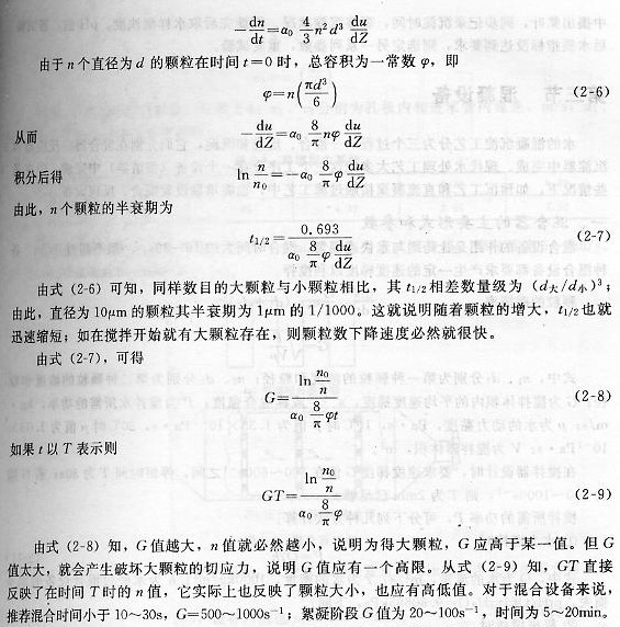 一、膠體溶液 膠體顆粒介質(zhì)介于10-9~10-7m之間。對(duì)于線形的高分子來(lái)說(shuō),含有103~109個(gè)原子的分組也屬于膠體顆粒。 1.膠體顆粒帶電的原因 2.膠體的結(jié)構(gòu) ⑴ 膠體的雙電層結(jié)構(gòu) ⑵ 膠團(tuán)的結(jié)構(gòu) 3.膠體的穩(wěn)定性 4.膠體的凝聚 二、混凝機(jī)理 三、絮凝動(dòng)力學(xué) ⑴ 借攪拌使膠體顆粒碰撞后凝聚 借攪拌使膠體顆粒碰撞后凝聚 設(shè)兩個(gè)球形顆粒在某一時(shí)刻朝同一方向運(yùn)動(dòng),速度差為du,相距為dZ,存在一個(gè)速度梯度G=du/dZ。 設(shè)單位體積顆粒數(shù)為n,直徑為d,速度梯度為G,則每秒單位體積的碰撞次數(shù)為: N0=(4/3)n2d3G 以α0代表顆粒相碰結(jié)在一起所需碰撞次數(shù)占相碰總次數(shù)的比例,則可得到顆粒數(shù)因相碰而減少的速率dn/dt為: ⑵ 混凝沉淀燒杯試驗(yàn) ⑶ 速度梯度計(jì)算 ⑷ 試驗(yàn)方法